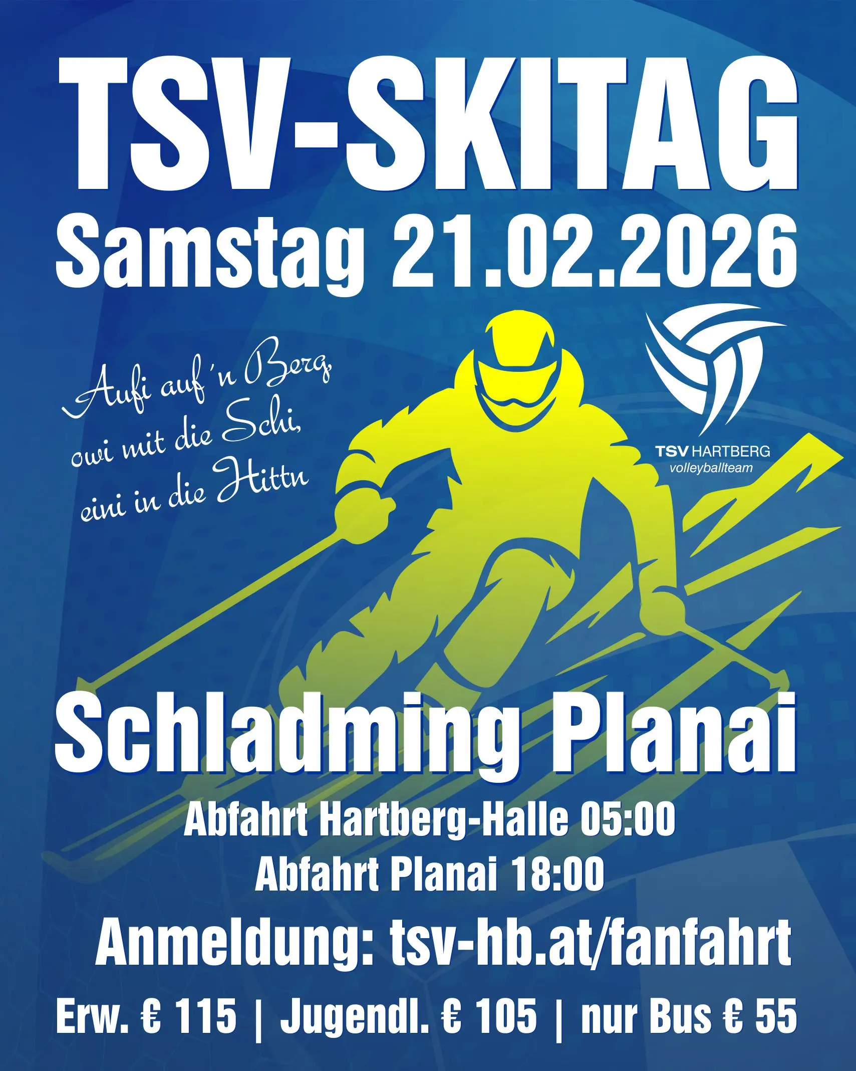 Der TSV lädt alle Mitglieder, Freunde und Unterstützer herzlich zum TSV-Skitag 2026 ein. Ziel ist die Planai – ein perfekter Skitag mit sportlicher Action und gemütlichem Beisammensein.